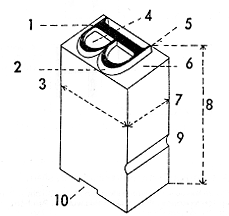 Abb. 1: Teile einer Letter: 1 Schriftbild, 2 Konus, 3 Schriftkegel, 4 Punzen, 5 Schriftlinie, 6 Achsel, 7 Dickte, 8 Schrifthöhe, 9 Signatur, 10 Fußrille