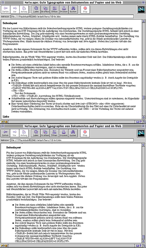 Amateure, die ihre eigenen Dokumente für das WWW aufbereiten wollen, sollten sich von diesen Entwicklungen aber nicht abschrecken lassen. Ein gutes und übersichtliches Layout läßt sich auch mit einfachen Mitteln herstellen.